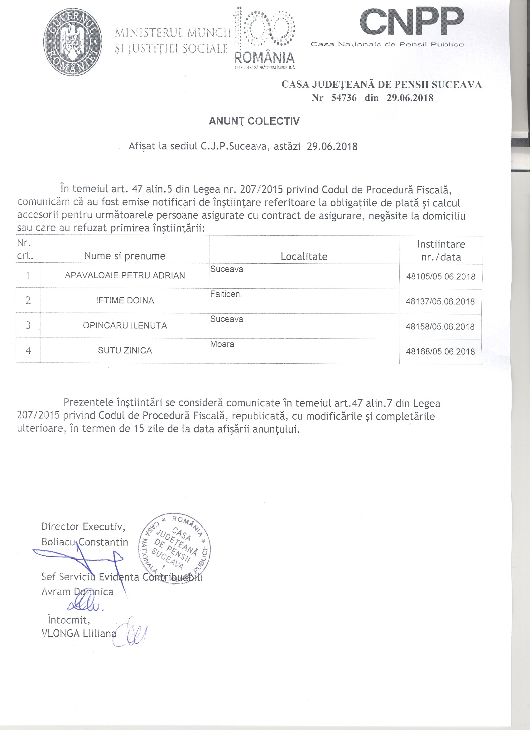Anunt nr. 54736 din 29.06.2018: Notificari pentru 4 asigurati: postat 29.06.2018
