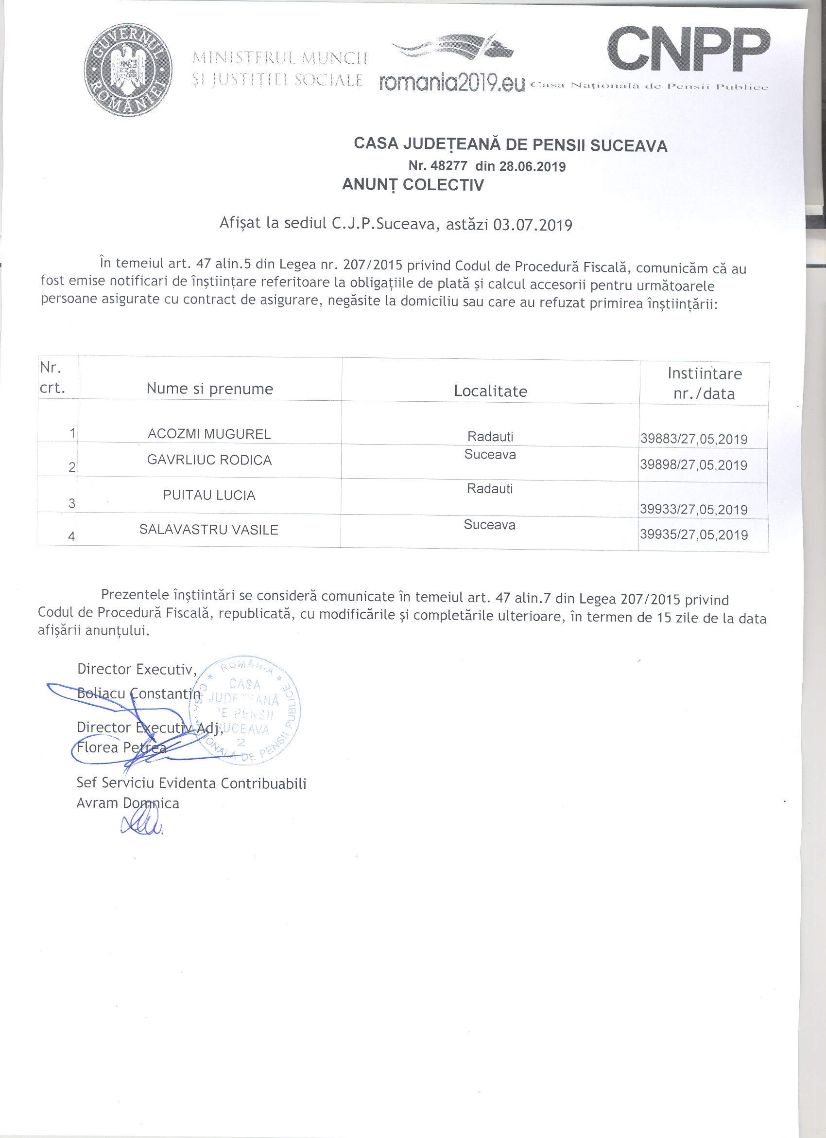 Anunt nr. 48277 din 28.06.2019: Notificari pentru 4 asigurati: postat 02.07.2019
