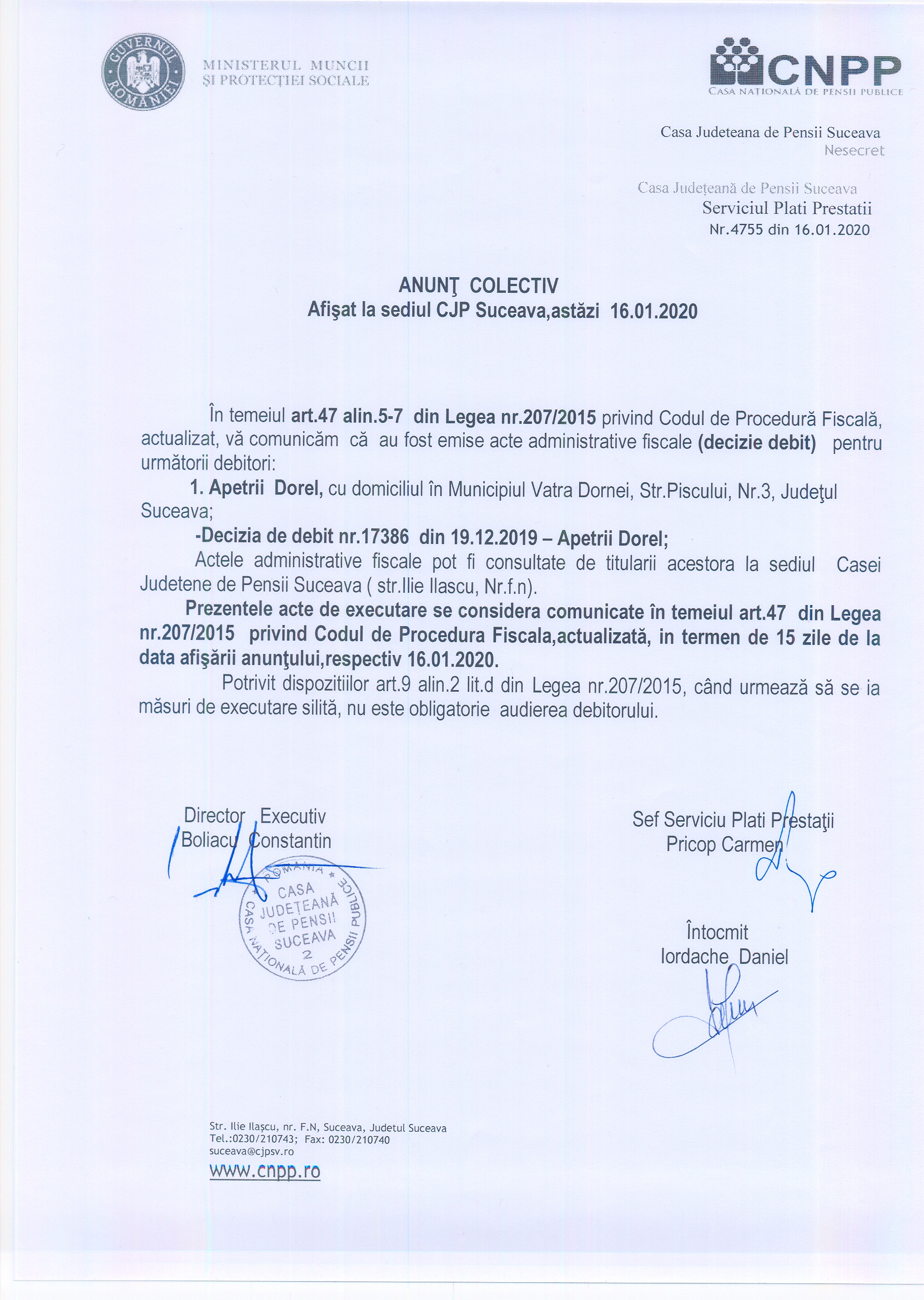 Anunt nr. 4755 din 16.01.2020: Apetrii Dorel: postat 16.01.2020