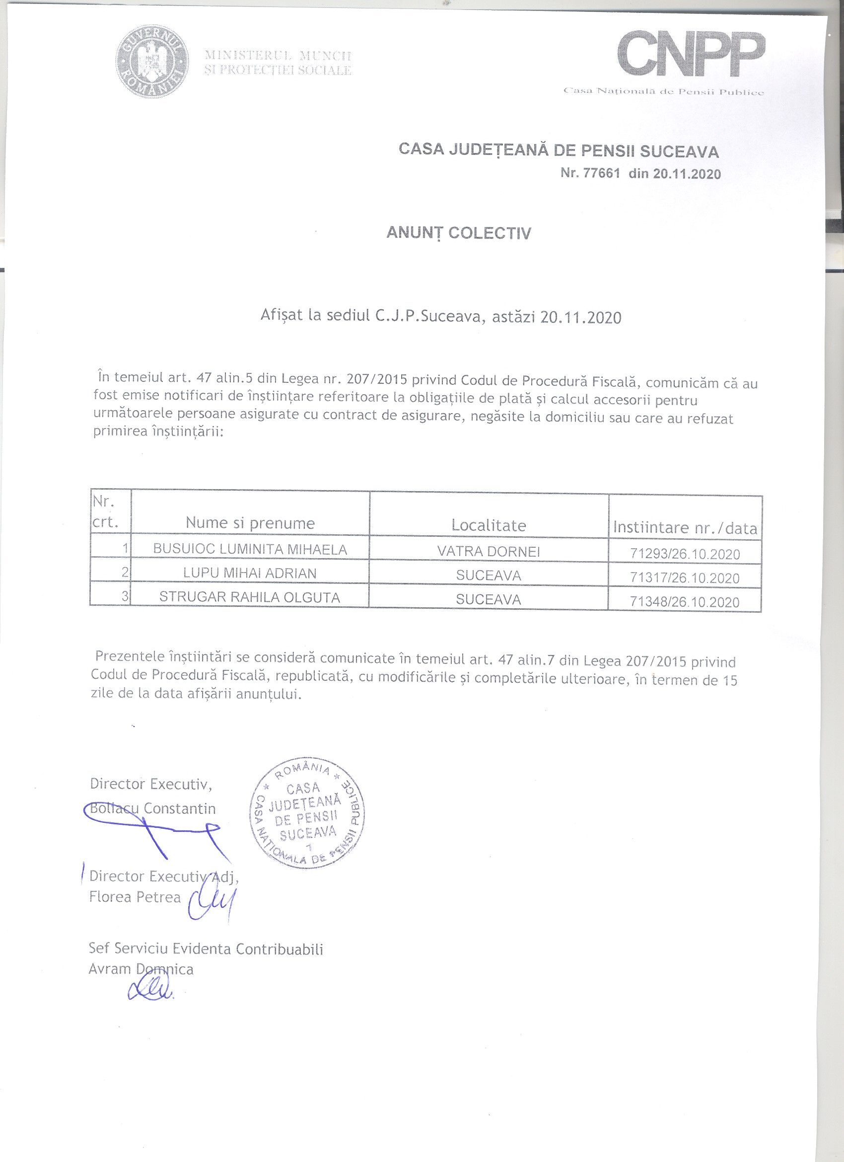 Anunt nr. 77661 din 20.11.2020: Notificare pentru 3 asigurati: postat 20.11.2020