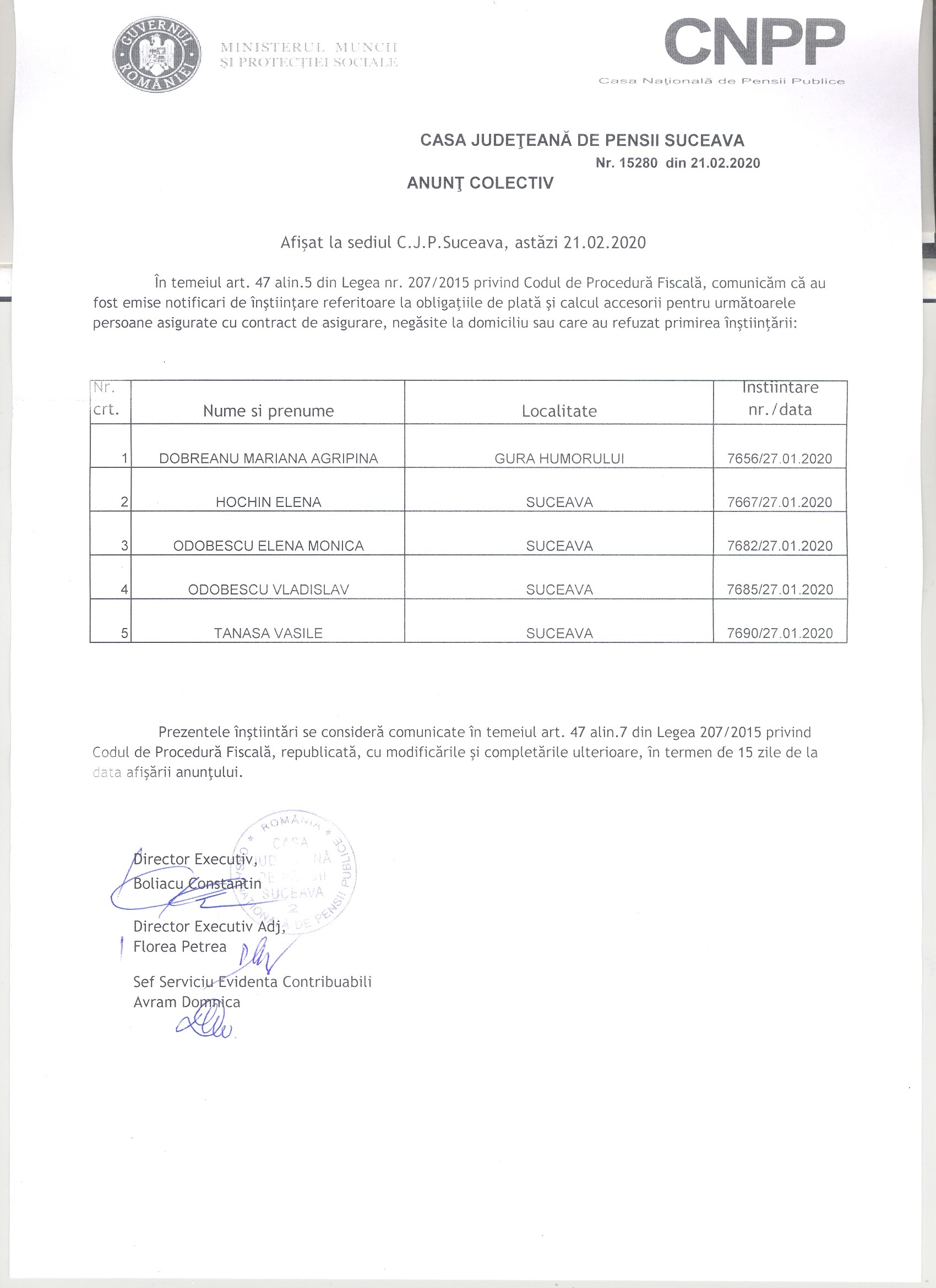 Anunt nr. 15280 din 21.02.2020: Notificari pentru 5 asigurati: postat 21.02.2020