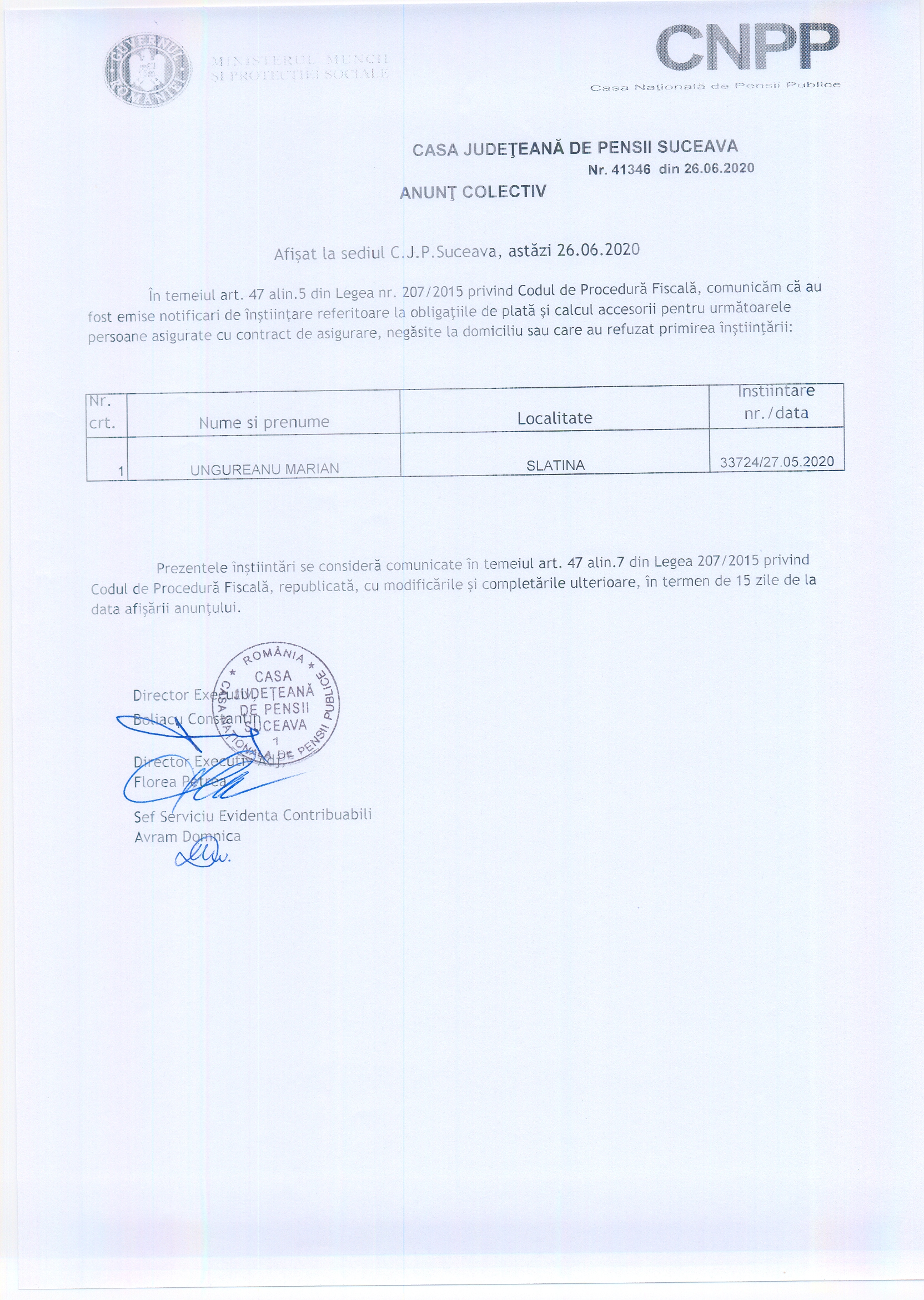 Anunt nr. 41346 din 26.06.2020: Notificare pentru Ungureanu Marian: postat 26.06.2020