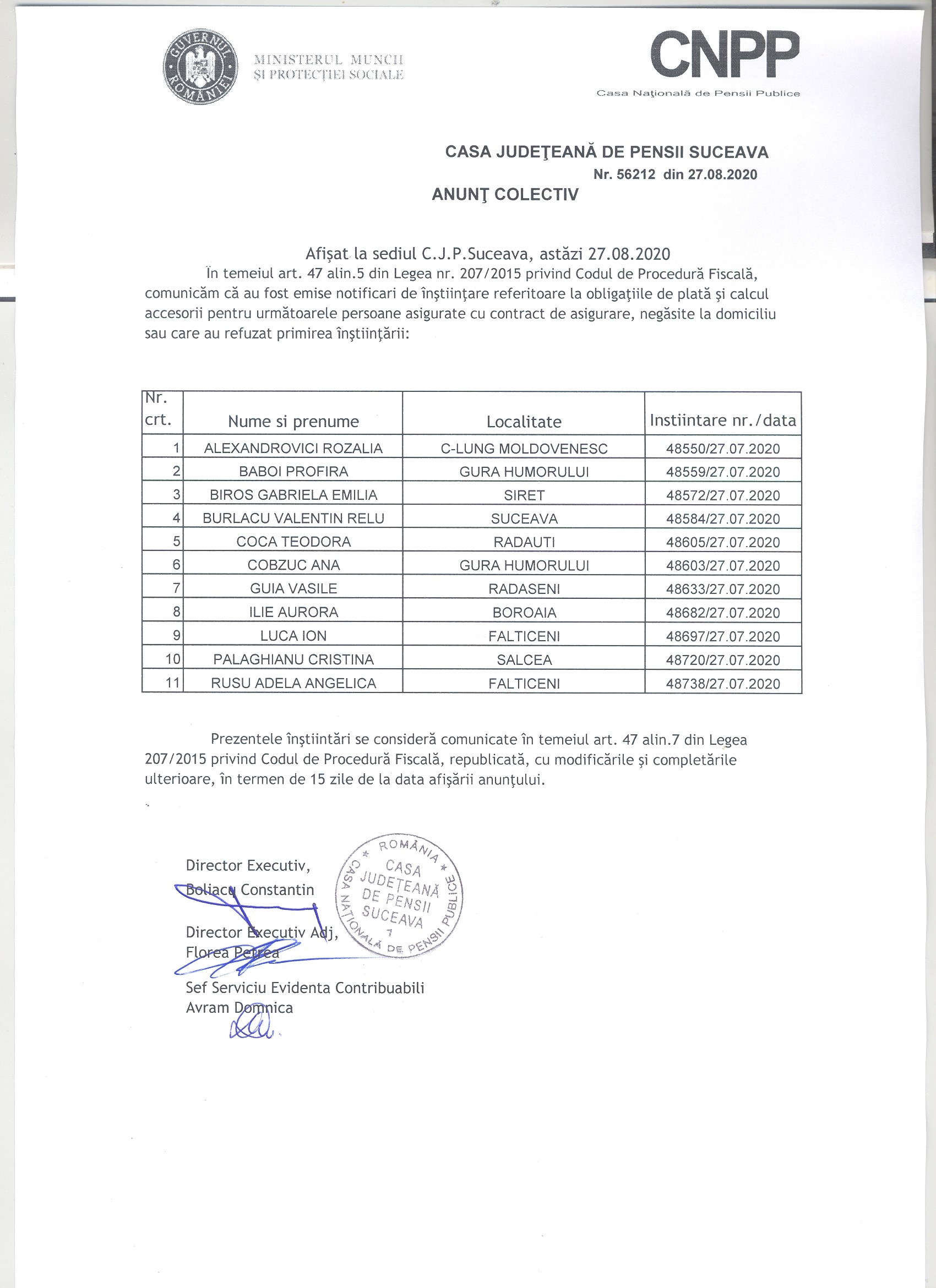 Anunt nr. 56212 din 27.08.2020: Notificare pentru 11 asigurati: postat 27.08.2020