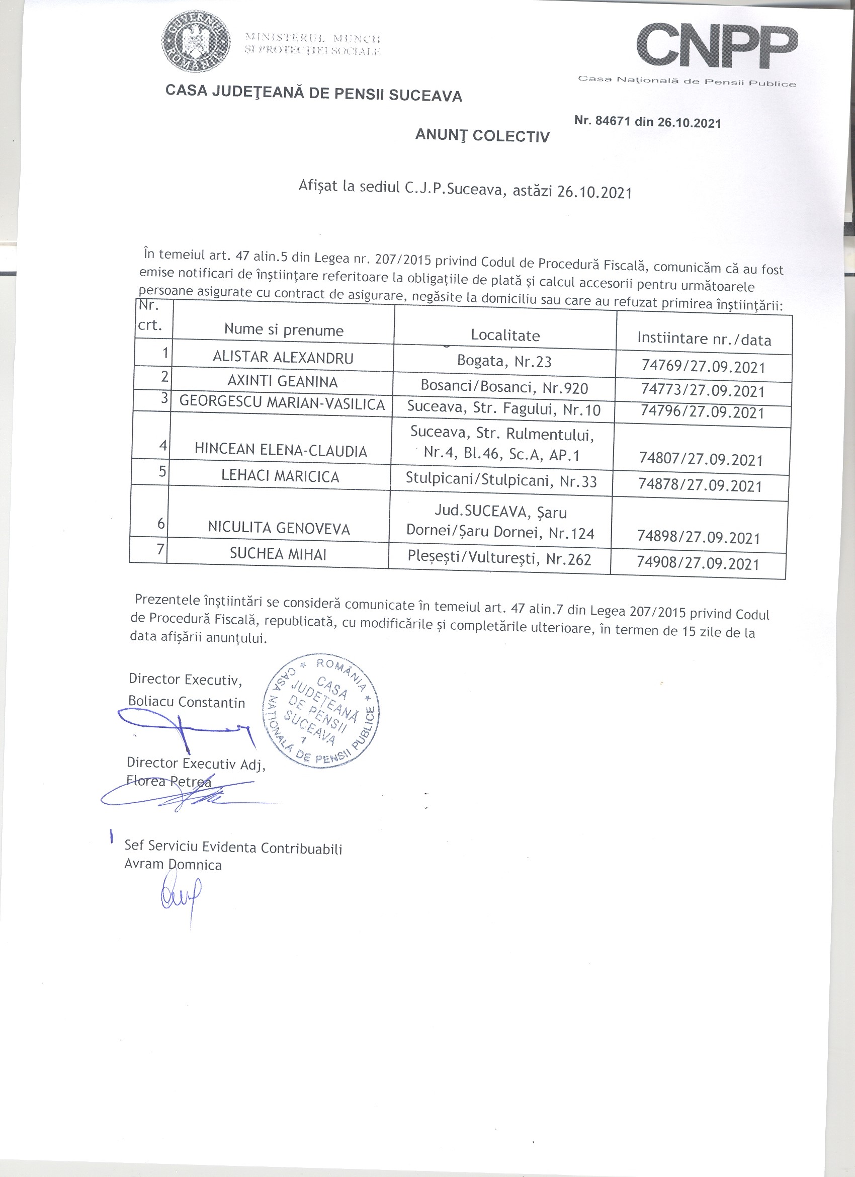 Anunt nr. 84671 din 26.10.2021: Notificare pentru 7 asigurati: postat 26.10.2021