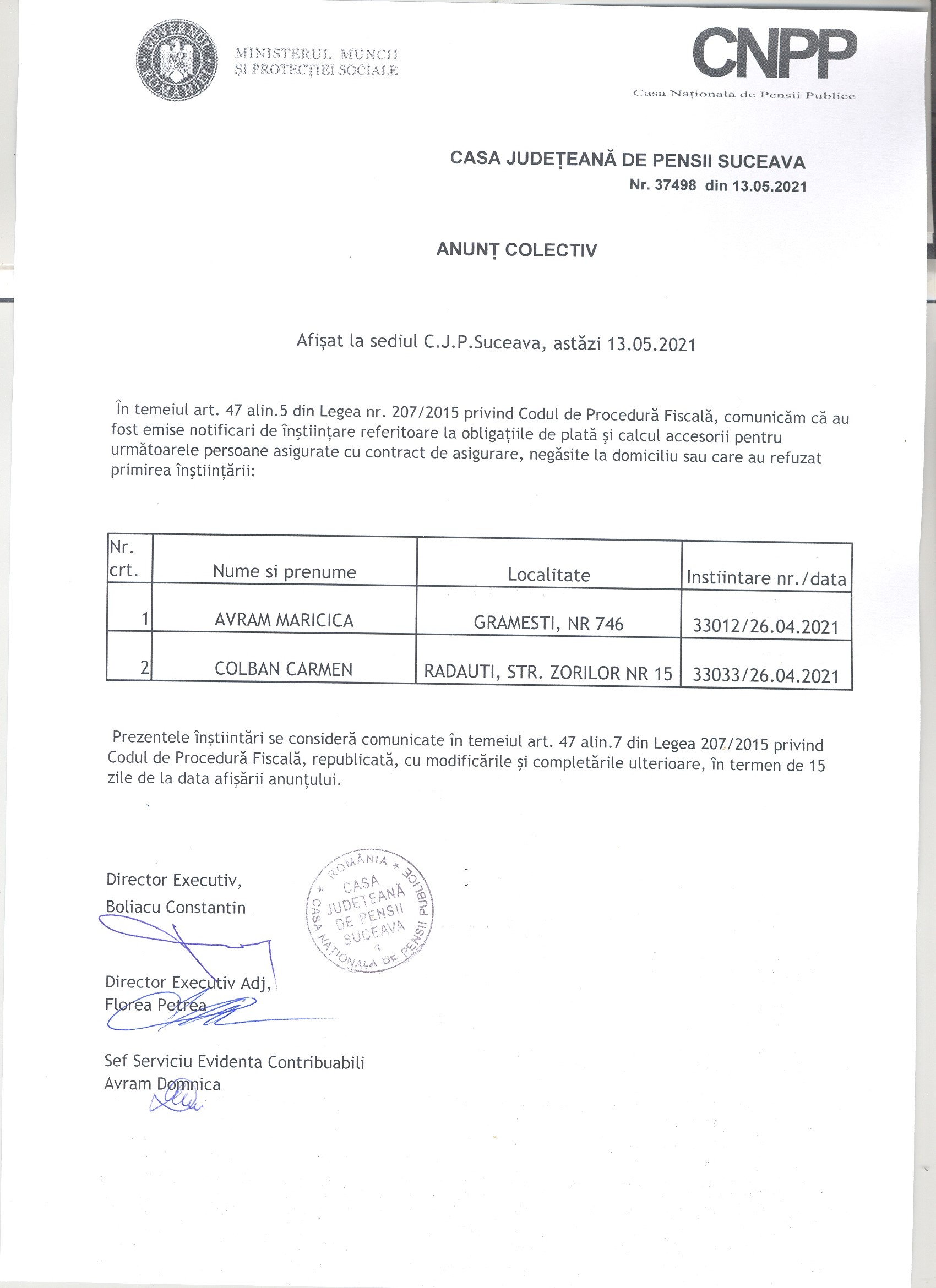 Anunt nr. 37498 din 13.05.2021: Notificare pentru 2 asigurati: postat 13.05.2021