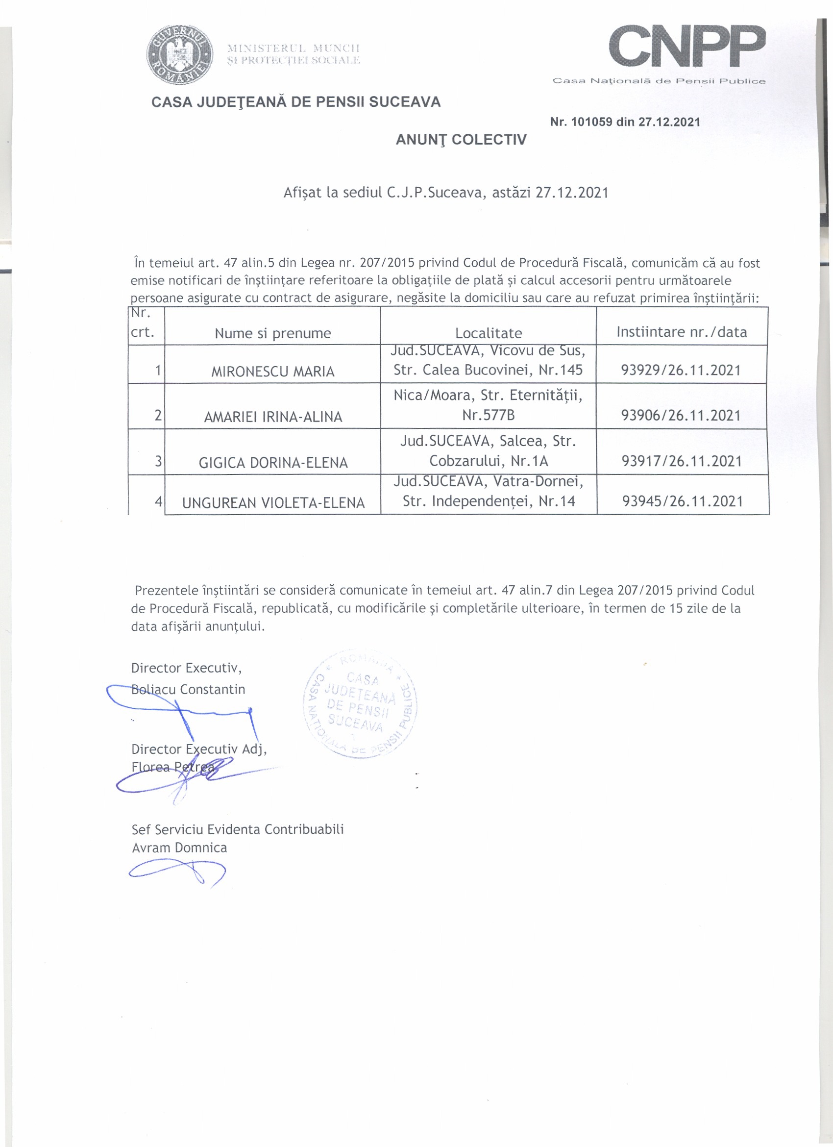 Anunt nr. 101059 din 27.12.2021: Notificare pentru 4 asigurati: postat 27.12.2021
