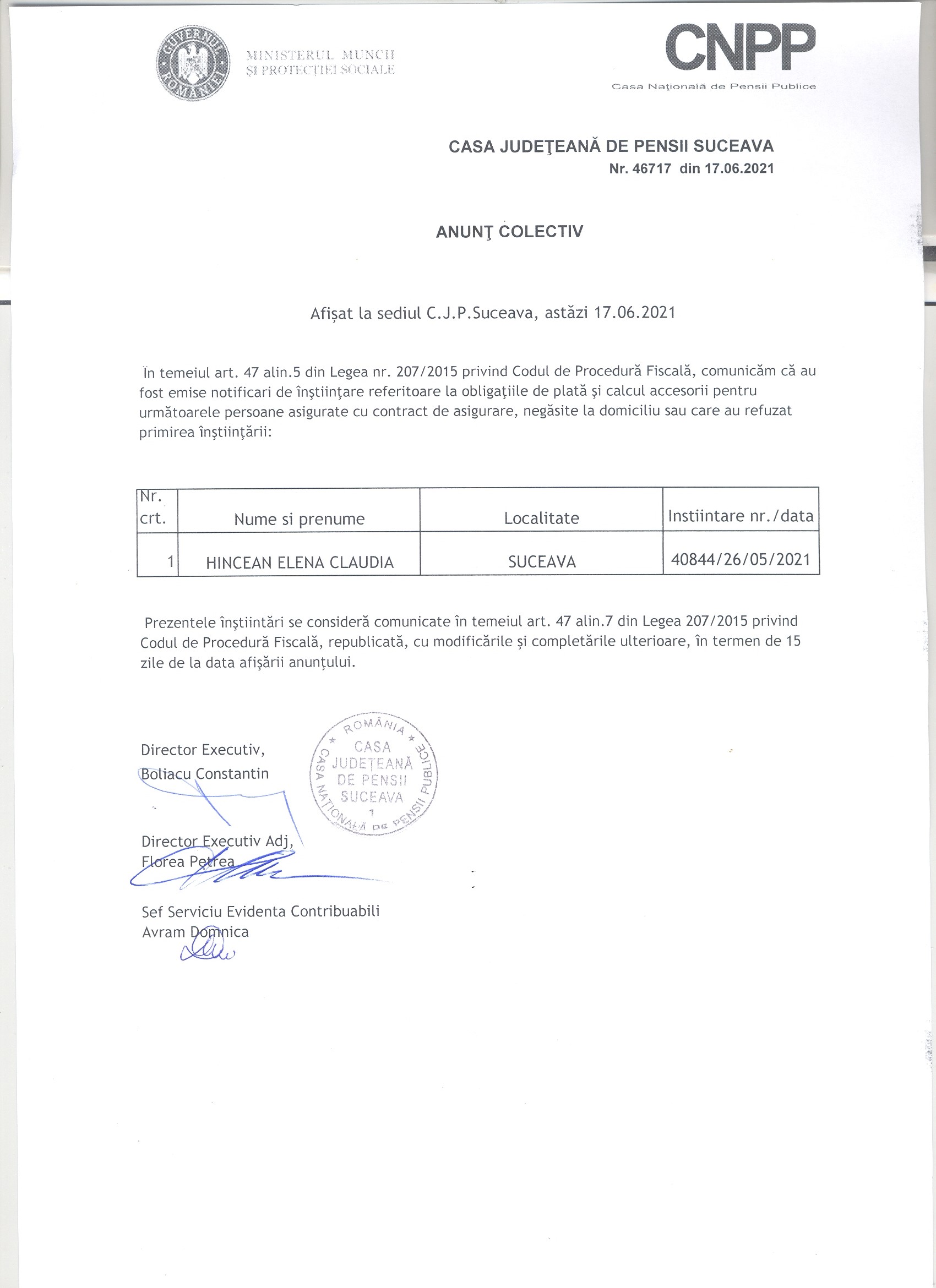 Anunt nr. 46717 din 17.06.2021: Notificare pentru Hincean Elena Claudia: postat 17.06.2021