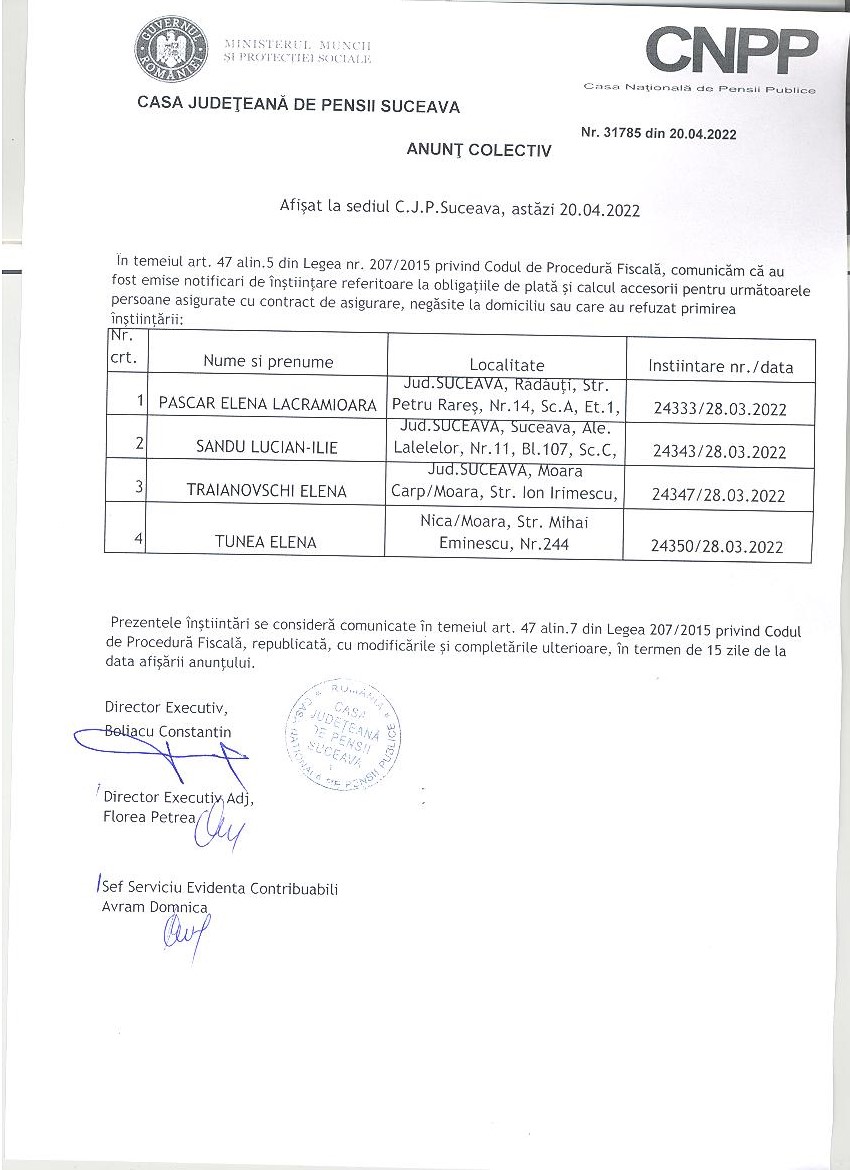 Anunt nr. 31785 din 20.04.2022: Notificare pentru 4 asigurati: postat 20.04.2022